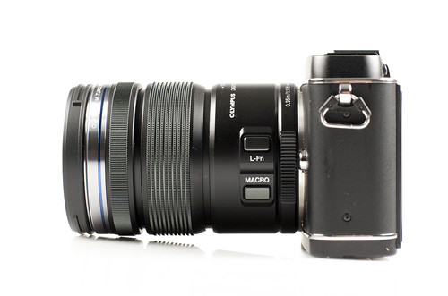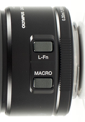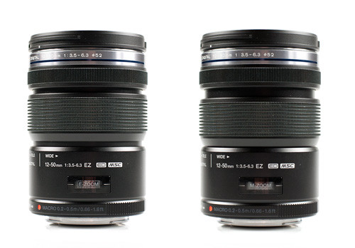 Kicsit lejjebb, a kitobjektívhez hasonlítva majd látni fogjuk, hogy a 12-50-es relatív hosszú felépítésű optika. Azonban sem zoomoláskor, sem élességállításkor nem változik a hossza, minden „tubuson belül” történik. Ennek elsősorban az időjárás-állóság érdekében kellett így alakulnia; elvileg esőben is nyugodt szívvel fotózhatunk vele – persze, megfelelően védett gépet feltételezve. A zoomgyűrű háromállású: a váztesthez közel húzva manuális módon történik a gyújtótávolság megválasztása, míg középállásban elektronikus úton (rövid billentésekkel jobbra, illetve balra). A harmadik pozícióban, amikor a zoomgyűrűt a frontlencséhez legközelebb toljuk, a lencserendszer makró módba vált. Ebbe a helyzetbe csak úgy tolható a gyűrű, ha előzőleg benyomtuk és nyomva is tartottuk a „MACRO” feliratú gombot a tubuson.