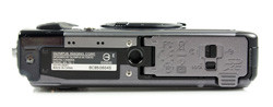 Az akkumulátort és a memóriakártyát a készülék alján kell behelyezni. Mindkét kiegészítőt egy vaskos, gumival szegélyezett, külön biztonsági retesszel ellátott ajtó védi a környezettől és a befolyó víztől. Furcsa, hogy az amúgy igen erős készülékvázra műanyag állványmenetet terveztek a mérnökök.