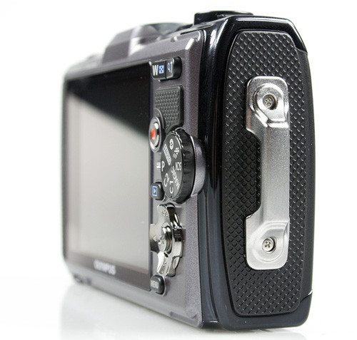 Az USB és a HDMI aljzat a készülék bal oldalára került, ezeket szintén egy vastagabb, biztonsági retesszel és gumiszegéllyel ellátott ajtó védi a beázástól és a portól. A másik oldalon egy igen combos fém(szerű) fül terpeszkedik: ide akár vastagabb csuklópántot vagy karabineres nyakpántot rögzíthetünk. Tartsuk azonban észben, hogy hiába vaskos ez a fül, csupán két apró csavarral rögzül a vázhoz.