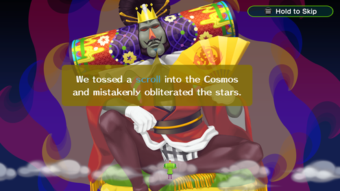 A Namco matekja szerint 14 év telt el a legutolsó „igazi” Katamari Damacy óta, így a One Upon a Katamari nem csak egy egyszerű folytatás, de akár egy új korszak kezdete is lehet a szériában. És ha már korszakok, hadd kössek át észrevehetetlen módon az új játékra, amelynek nagy narratív csavarja a kozmosz újabb véletlen baleseti megsemmisülését követően az időutazás. Felejtsük el egy pillanatra, hogy ugyanez a sztori vezérelte a Katamari Amore egyik DLC-jét is; nem kell minden történetnek abszolút eredetinek lennie ahhoz, hogy szórakoztasson, és a Once Upon a Katamari a szériától megszokott bohókásan tálalt félbolond sztorijával ezt maradéktalanul hozza is. Minden bizarr átvezető jelenet megmosolyogtatja a játékost, ahogy a saját nagyságától eltelt kozmoszkirály megnyilvánulásai is igen vidám perceket okoznak majd.