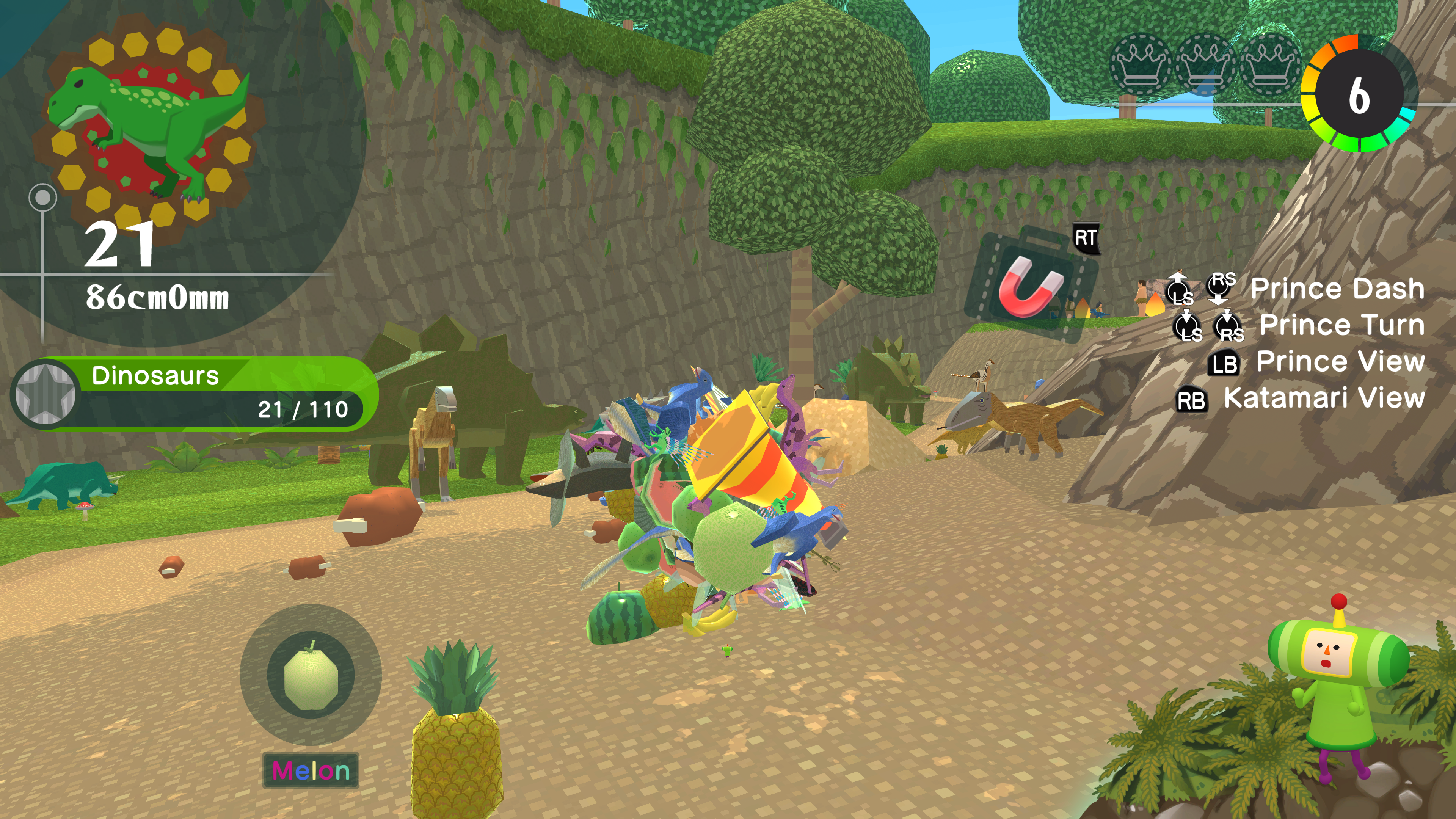 Ez meglehetősen nagy gond, még akkor is, ha ezen kívül a játék hozza a kötelezőt. Az engine továbbra is üdítően kevés poligont használ, és ez azonnal felismerhető, és igencsak szerethető látványt biztosít a Once Upon a Katamarinak. Azon már lehetne vitatkozni, hogy az új zenei anyag hová esik a régiek rangsorában – szerintem nem ér fel a nagy klasszikusokhoz, de legalább van olyan kiadás, amiben a régi nagy slágerek is benne vannak. Engem ez sosem motivált ebben a sorozatban, de megint tonnányi gyűjtögetnivaló akad: 69 kuzint lehet begyűjteni, kismillió ajándékdobozra bukkanhatunk, és ezúttal minden pálya három aranykoronát is rejt. Ezek csak a karakter, illetve az űrhajó átalakításában játszanak szerepet, magára a játékmenetre nincsenek kihatással. Utóbbira a powerupok valók, amelyekből most több van, mint valaha, de hiába hasznos az órát leállító vagy a katamarit ikerrakétákkal gyorsító ikon, a legjobb érzés még mindig a mágnes használata.