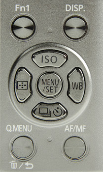 A hátlap a tipikus, letisztult Panasonic-féle képet mutatja. A nyomógombokkal és a vezérlőtárcsával már találkozhattunk nem egy DMC-n. A két fizikai „Fn” jelölésű gombok mellé további két „szoftot” kapunk, melyeket az érintésérzékeny kijelző simogatásával bírhatunk munkára. Ezeket a menüben lehet funkciókhoz rendelni (összesen 25 választható gombonként). A négy süllyesztett gombon kívül kényelmesen üzemeltethető mind, a hüvelykujj támasza nagyon sokat javít a váz fogásán. A tárcsa tekeréséhez az átlagosnál nagyobb erő kell, nyomáspontja sem épp lágy, azonban ezt idővel meg lehet szokni, és sokkal pontosabban használható, mint a visszajelzés nélküli, „kásás” vezérlők.