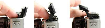 A beépített kis villanó retesze nem elektronikus, tehát akkor is felnyitható, ha a gép ki van kapcsolva. Csuklórendszere lehetővé teszi – ha ujjunkkal megfelelően lefogjuk –, hogy akár a plafonra vagy a padlóra vakuzzunk (a villanófej külön is lehajtható). Teljesítménye bőven elegendő árnyékos részletek derítésére.