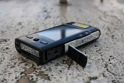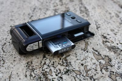 Az oldalt helyet kapó fémes díszlécek dobnak az összképen, ráadásul funkcióval is bírnak. Ezek mögé rejtették el ugyanis egyik oldalt az USB és az AV csatlakozót, továbbá itt kapott helyet a zoom és a bekapcsológomb is. Az átellenes oldalra jutott a mikrofon, illetve a memóriakártya, valamint az akkumulátor kis zuga. A védőlemezt egy enyhe nyomással lehet odébb pöckölni, de pont akkora erő kell hozzá, hogy véletlenül ne nyílhasson ki, a foglalatok pedig stabilan tartanak. Mint ahogy ebből is kitűnhet, külön tápcsatlakozó nem került rá, a töltése egyszerű, hiszen az USB segítségével egy számítógépbe kell bedugni, és azon keresztül kapja a működését biztosító energiát. Sajnos a HDMI portot is lespórolták róla, ami ma már kicsit érthetetlen, bár az jó pont, hogy az AV kábel alapkiszerelésben jár hozzá.