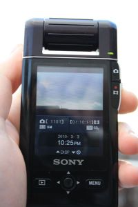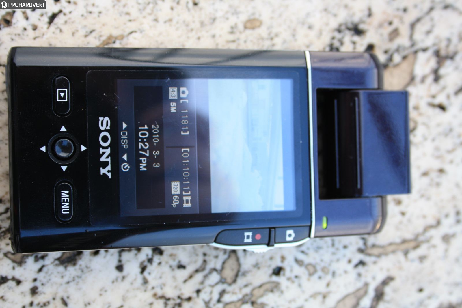 A frontfelületet uralja a 2,4 hüvelykes LCD kijelző. Ennek jobb felső sarkánál található a fényképezés és a videófelvétel indításának gombja, valamint a zoom csúszkája. Alulra már csak három gomb került, a lejátszást indító Play, a menü elérésére szolgáló, fantáziadús nevű Menu, illetve a négyirányú kurzor. A bloggie remekül fest kívülről, a lekerekített élek jól néznek ki, a gombok mérete megfelelő, ezek könnyen elérhetőek, és a felhasznált anyagokba sem lehet belekötni. Strapabíró, nem csúszkál, kényelmesen simul az ember kezébe, a külseje gyakorlatilag hibátlan!
