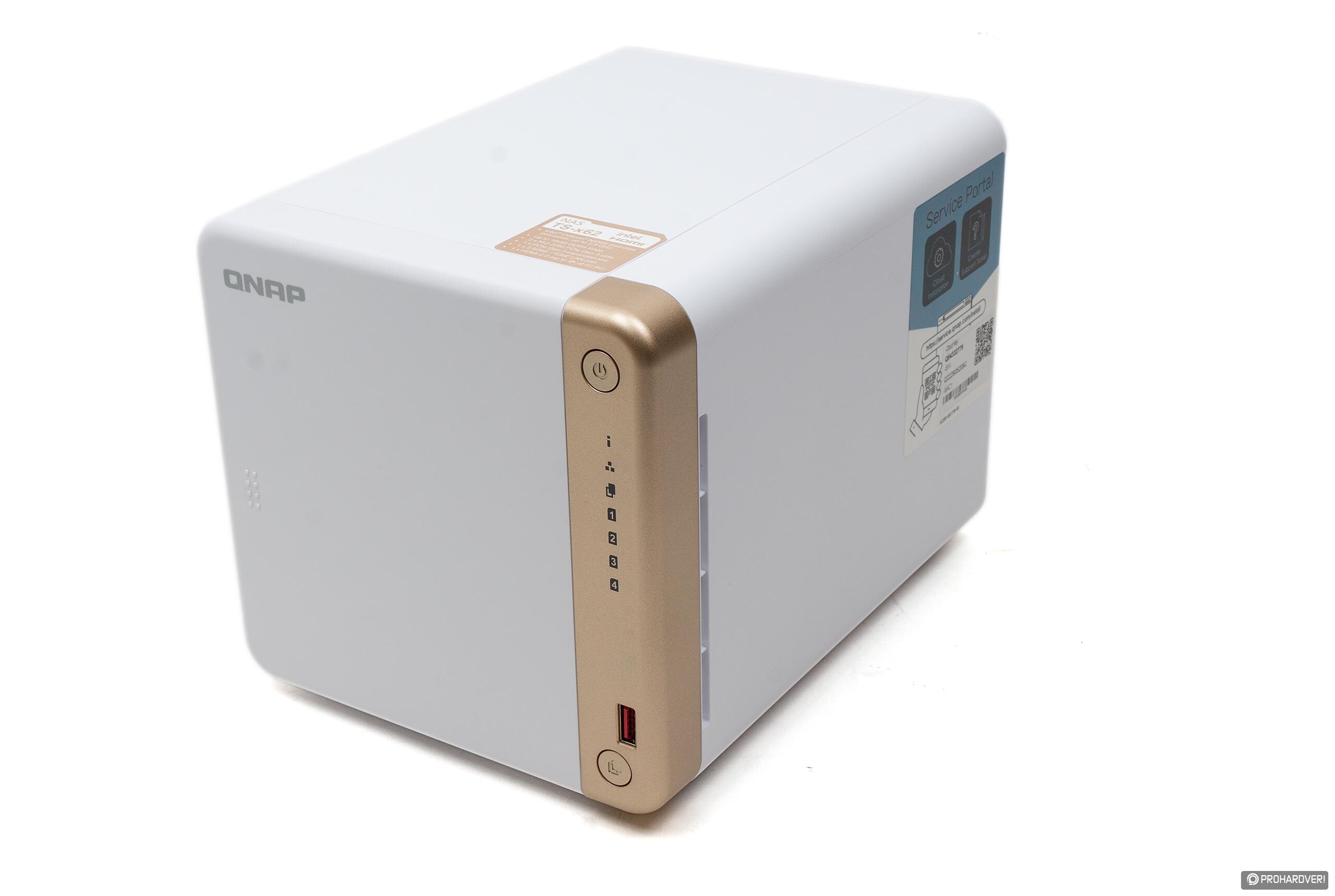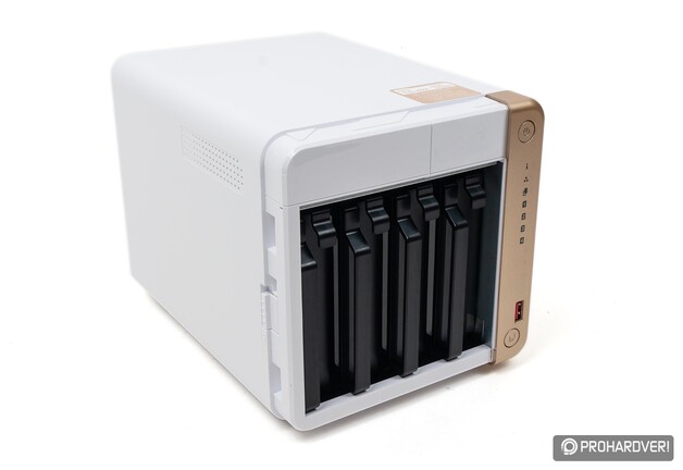 Mivel a TS-462-t az otthoni, kisirodai piacra szánja a QNAP, olyan burkolatot kapott, amely ehhez a szegmenshez passzol, ez a lekerített éleket, a fehér és arany színeket és főképp a rejtett HDD fiókokat jelenti. Persze ettől még ez egy NAS, és csak a nagyon szórakozottak fogják összekeverni például egy mini hűtőszekrénnyel. Mérete 168 x 170 x 226 mm, tömege pedig üresen 2,3 kg, igazán nem nehéz tehát neki helyet találni. A kezelőszervek – két gomb, egy a be- és kikapcsolásra, egy pedig a szintén itt elhelyezett, előlapi USB 3.2 Gen2 portba csatlakoztatott eszköz adatainak azonnali mentésére –, illetve a visszajelző LED-ek mind az előlap jobb szélén lévő, aranyszínű sávban foglalnak helyet.