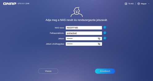 A meghajtók behelyezése és az előlap bezárása után csatlakoztathatjuk a kábeleket és bekapcsolhatjuk a NAS-t, majd jöhet a szoftveres rész, mely ismerős lehet már korábbi tesztjeinkből. Az első lépésben érdemes a QNAP által kínált Qfinder Pro alkalmazással „megkeresni” az eszközt, és innen elkezdeni a konfigurációt, de természetesen nincs akadálya annak sem, hogy az IP cím ismeretében egyből a böngészőből kezdjük a műveletet. A folyamat most is egy varázsló segítségével, lépésről lépésre vezet végig a QTS 5 aktuális verziójának (illetve, ha nincs külső netkapcsolat, a NAS alapmemóriájába gyárilag telepített verziójának) telepítésén. Ennek során ami talán szokatlannak, de az elmúlt idők zsarolóprogramos támadásainak fényében érthetőnek tűnik, az az, hogy a rendszergazda fióknál rögtön meg kell adni egy felhasználónevet is, és amint ez kész, az „admin” nevű usert a rendszer deaktiválja.