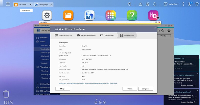 Miután az alapbeállításokkal megvagyunk, jöhet a tárhely konfigurálása, mely ismét varázsló segítségével történik. A folyamat ezen része talán már igényel némi jártasságot, de a QTS elég segítőkész, így minimális tudással is el tudunk jutni oda, hogy egy kötetet létrehozzon, azon pedig például megosszon egy könyvtárat.
