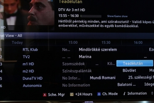 Egy képernyőn láthatóak a csatornák, a műsorok, a sarokban fut a tévéadás képe, felül pedig rövid leírás olvasható a kiválasztott műsorról. Beállítható, hogy a készülék automatikusan odakapcsoljon egy kijelölt programra, tehát az időzítés is működik. Egy külön felületen meg lehet nézni, hogy miket választott ki az ember korábban, és ezek közül természetesen kedvére törölhet is. A távirányítón található info gomb segítségével egyébként részletes információk is kérhetőek egy adott műsorról, annak kezdési időpontjáról, hosszáról, illetve tartalmáról is, ez nem is szokatlan. Egyedül az hiányzik, hogy stílus szerint is ki lehessen listázni a programokat.