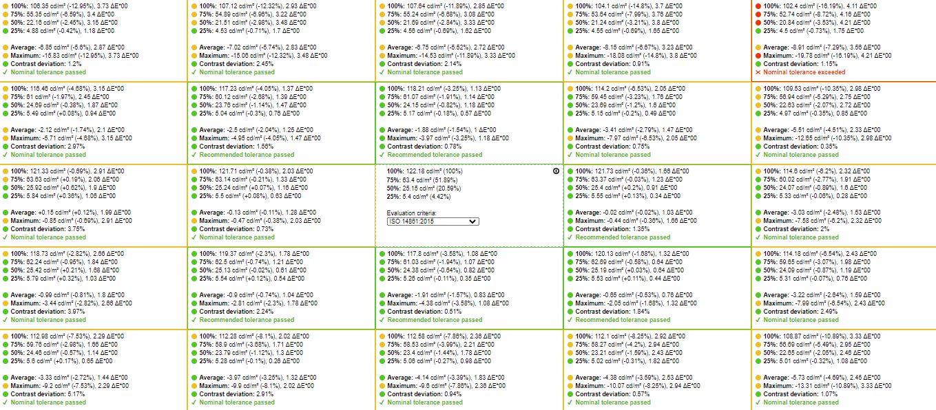 Homogenitásvizsgálat: fénysűrűség mértéke az egyes fényerő-beállítások mellett [+]