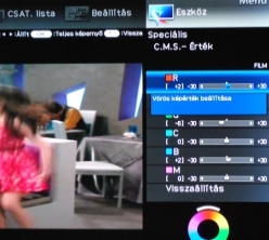 Más tévéknél eddig nem látott menüpontokkal is találkoztunk. A C.M.S. (color management system) Árnyalat funkcióval egy hatszínű beállítórendszer segítségével módosíthatjuk egy kiválasztott szín árnyalatát. A C.M.S. Telítettséggel csökkenthetjük egy-egy tónus telítettségét, a C.M.S. Értékkel pedig az egyes színek fényerején módosíthatunk. Nem egy egyszerű és gyors játék ez, szó se róla, de ha valaki veszi a fáradságot, akkor tényleg az utolsó porcikájáig a saját igényeihez idomíthatja a képminőséget, ami mindenképpen pozitívum.