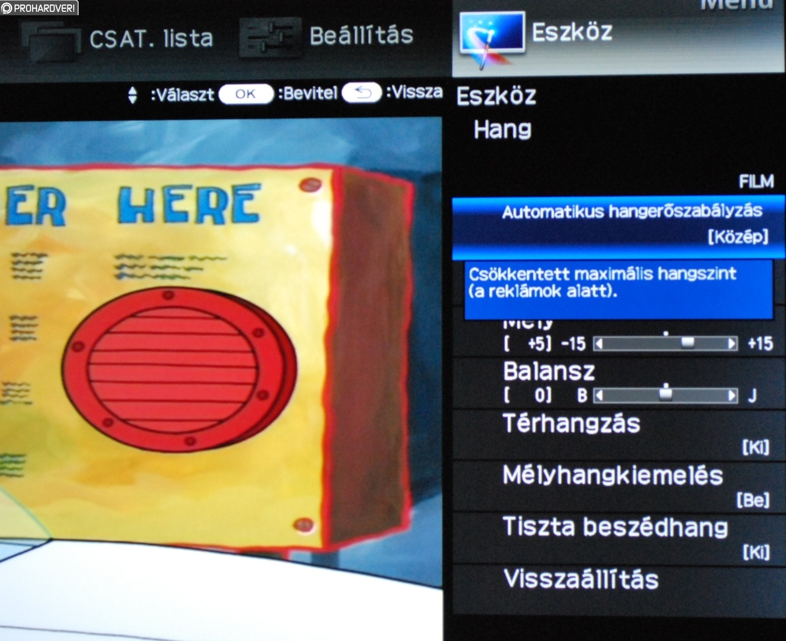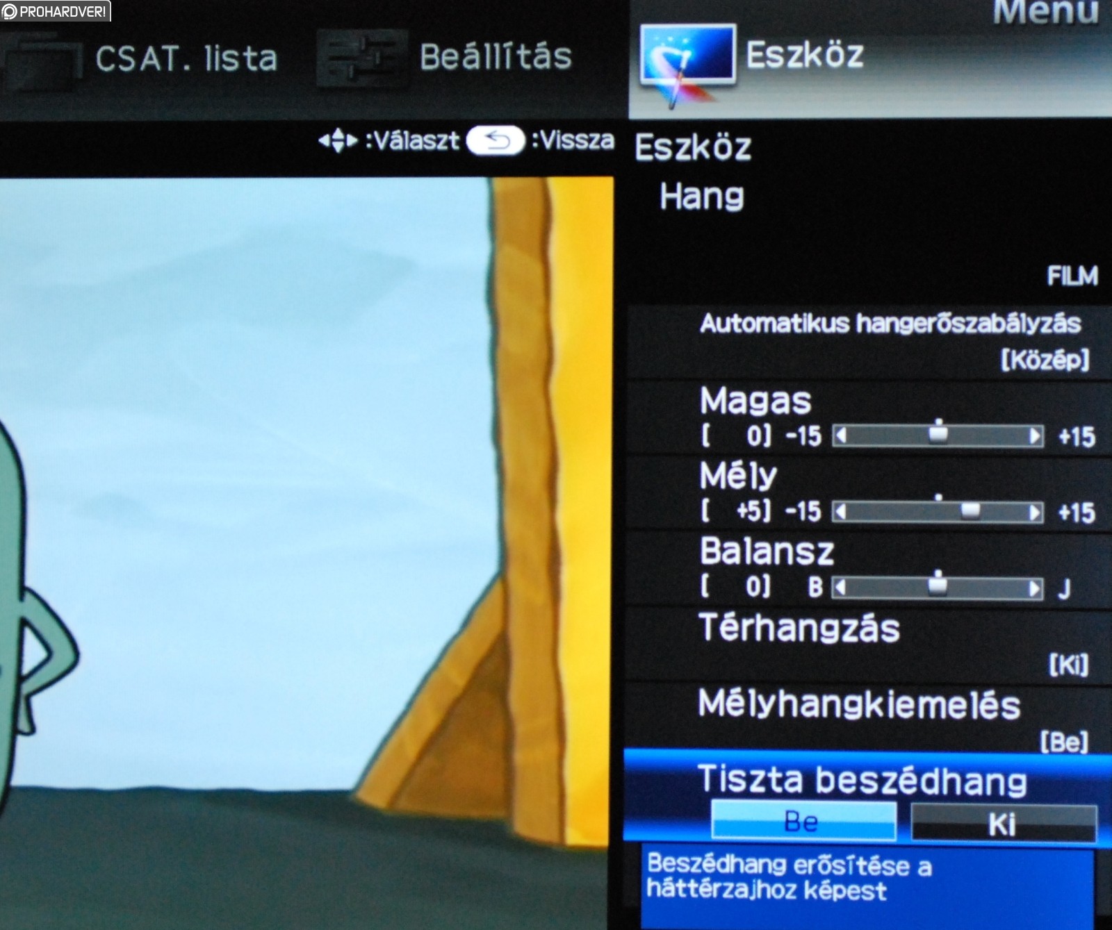 Az automatikus hangerőszabályozást érdemes bekapcsolni, ami a berobbanó reklám ellen elég jó fegyver. Viszont nem árt alacsony vagy közepes fokozaton hagyni, mert a magasnál már nagyon tompa lesz a hangzás. A mélyhangkiemelést sem butaság aktiválni, mert a basszusok alapból nagyon satnyán szólnak. Így se kell számítani gyomorrengető mélyekre, de egy fokkal jobb lesz a végeredmény. A tiszta beszédhang kiemelése pedig értelemszerűen a beszélgetős műsoroknál lehet hasznos, bár bekapcsolása nem jár jelentős változással.