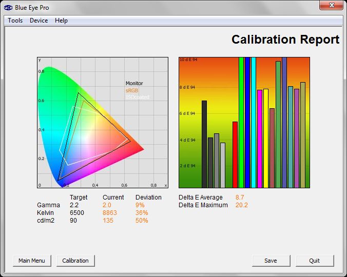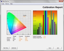 Egy kalibrátorral, illetve a LaCie Blue Eye Pro névre hallgató alkalmazás segítségével vettük szemügyre tüzetesebben az előzetes beállításokat. Sorrendben ezek a következők: Auto, Dinamikus, Dinamikus (Rögzített), Film, Játék, Szabványos. A kép jobb oldalán látható, hogy a bemért 18 szín milyen mértékben tér el a referenciától. Ennek meghatározására használatos a delta E, ami egy olyan numerikus érték, amely két különböző szín távolságát határozza meg egy színrendszeren belül. Minél kisebb a delta E értéke egy adott színnél, annál közelebb áll a referenciához, vagyis annál jobb. Kár, hogy a kalibrátor semmit sem tudott kezdeni a Quattron technológiával. Az itt látható értékek nem reálisak, hiszen a kép minősége korántsem ilyen szörnyű. Emiatt aztán az ideális beállítások megtalálásakor is inkább a szemünkre bíztuk magunkat.
