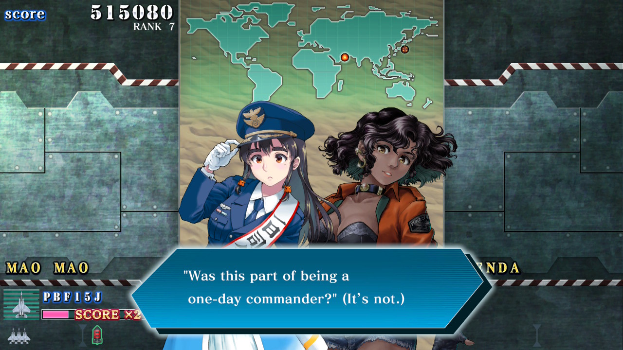 Bár a Sonic Wings Reunionról sokáig az a hír járta, hogy az a sorozatindító epizód remake-je lesz, a végül megjelent verziót már folytatásként hirdeti a kiadó. A különbség elsősorban a választható karakterek listáján és különleges képességeiken érhető tetten: bár alaphelyzetben itt is nyolc pilóta vár ránk, az öt ismerős mellett két újonc, valamint a Sonic Wings 2-ben debütált delfin, Whity szerepel a listán. Néhány végigjátszással a lista bővíthető is, nekem eddig két extra karaktert sikerült megnyitni, kifejezetten tápos repülőkkel. Merthogy a valós vadászgépek és fantáziaszülte masinák között vannak azonnal érezhetően gyengébb és erősebb darabok is. Az utólag megnyitható Kotomi például gépágyúja mellett nyomkövetős rakéták egész felhőit eregeti, amivel sokkal hatékonyabb, mint mondjuk Keaton F-18-asa. A játék egyébként nem nehéz: Normal fokozaton második nekifutásra egyetlen continue felhasználásával értem a végére. Ez amúgy narratív örömet nem nagyon okoz, hiszen a Fata Morgana nevű szervezet ellen vívott háború zéró extra kontextust kap a pályák közti nonszensz minipárbeszédek nyomán.