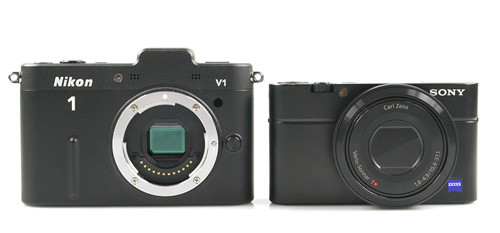 Felülnézetben – balról jobbra haladva – a következő építőelemek fogadják a nézelődőt: a vaku, a sztereó mikrofon két apró nyílása, a bekapcsológomb, a kioldó a zoomgyűrűvel és a nagyon jól eltalált nyomatékkal működő módválasztó tárcsa. Végül itt van még két összehasonlító fotó a szintén 1”-os szenzorral szerelt Nikon 1 V1-gyel:
