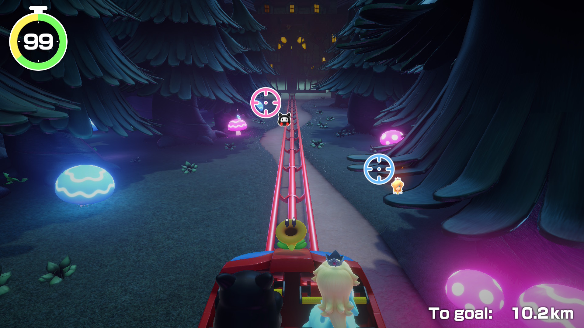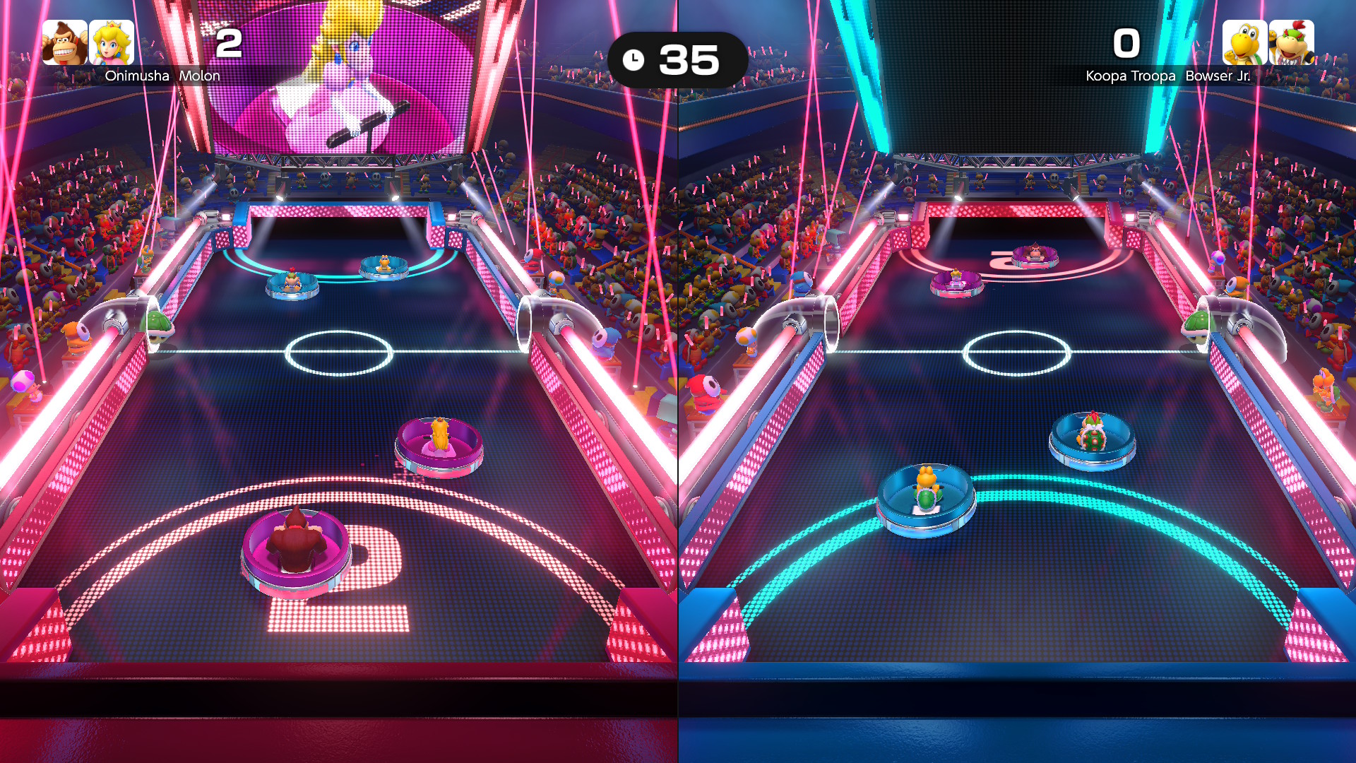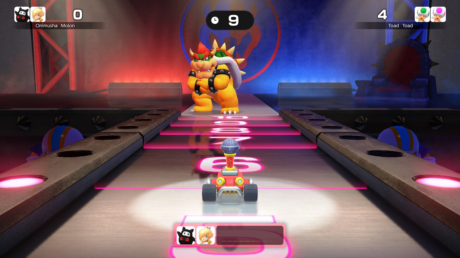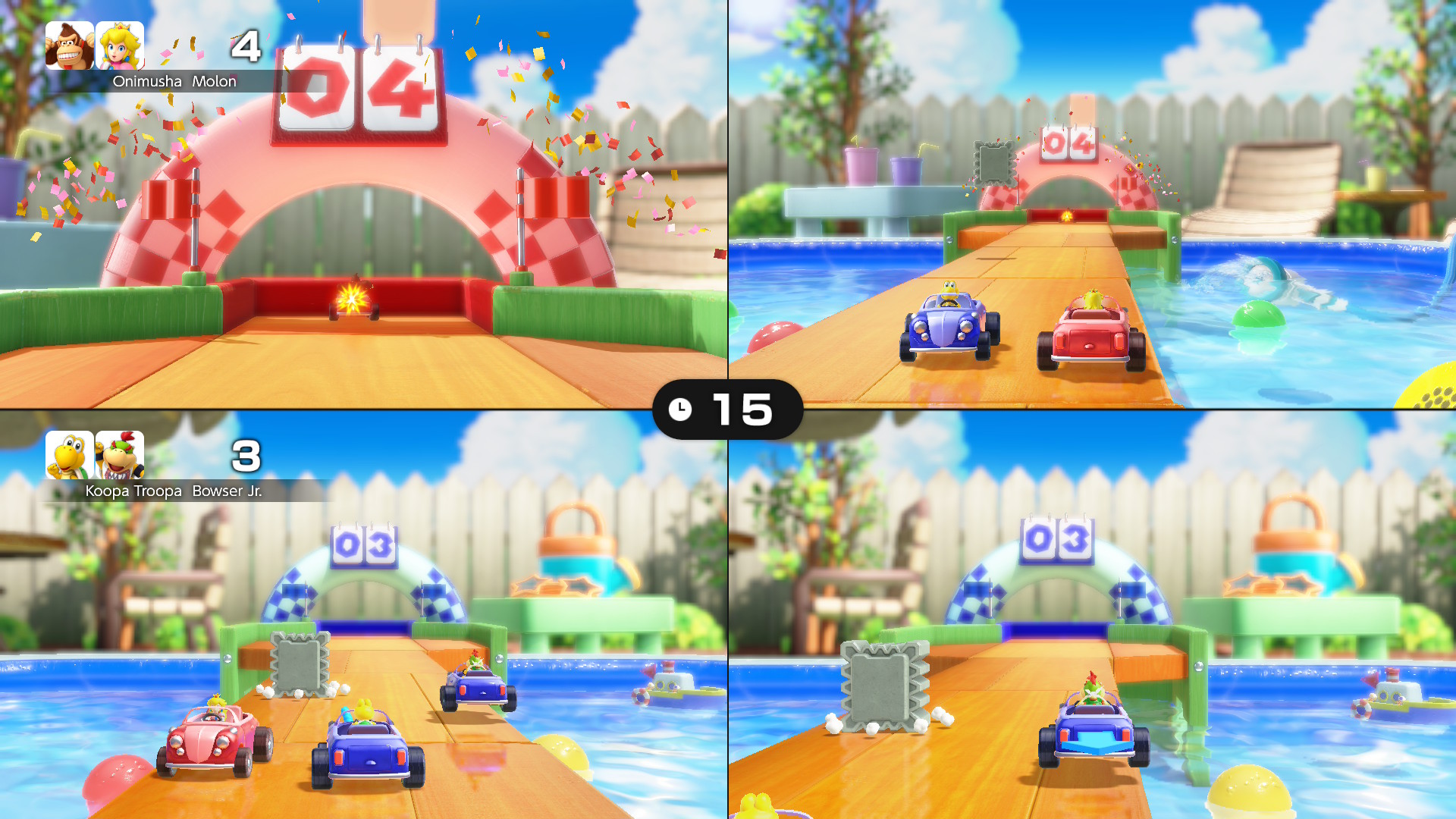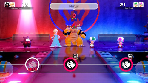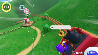 Az extráknak még nincs vége: a Carnival Coaster egy on-rail shooter pároknak, ahol ketten kell lövöldözni a megjelenő ellenségekre, miközben egy hullámvasúton suhannak. A gonosz csoportok kiiktatása extra időt biztosít, ahogy az is, ha feltesszük kezeinket a lefelé „zuhanós” részeknél. Útközben egyéb minijátékokat kell teljesíteni, az eredmény függvényében pedig további plusz másodperceket lehet halmozni, hogy legyen idő a teljes pálya befejezéséhez. Ez egyébként nagyon szórakoztató és egyszerű módja a közös játéknak, főleg, ha csak gyorsan akarunk nyomni valamit. A legtöbb új minijáték a Joy-Con 2 egér módját használja ki, és ezek nagy átlagban igen szórakoztatóak lettek. Van léghoki, levélrendezés, dominópakolás, kisautófelhúzás és sok egyéb magától értetődő feladat, amik ötletessé és jópofává teszik az egész élményt. Ezek visszaköszönnek a hullámvasútnál is, illetve, a mikrofonosokkal együtt a Jamboree TV saját Mario Party módjában is. Kifejezetten precíz a vezérlés, és nagyon találó, hogy mennyiféleképp tudták felhasználni ezt a lehetőséget a fejlesztők. (Egy potenciális WarioWare-játékban is szívesen viszontlátnám ezt a vezérlési módot!) A Jamboree TV utolsó módja pedig szimplán az, hogy külön-külön lehet játszani a minijátékokkal, akár gyakorolni, akár csak orrvérzésig tolni egy-egy remeket – mint például a nálunk közönségkedvenccé vált léghokit.