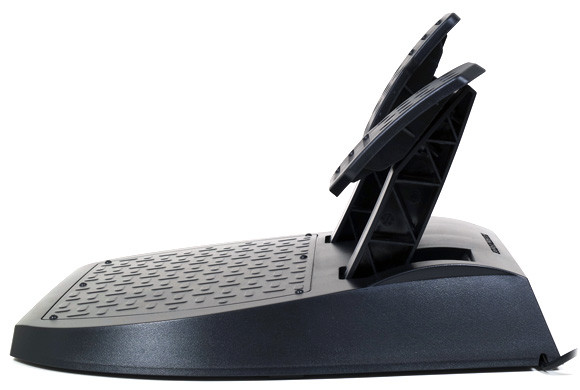 Pedálban a kategória átlagát hozta a Thrustmaster megoldása. A Logitech vetélytársénál kicsivel meredekebb szögben áll a gáz és a fék, ezért formula autósan inkább előrefelé kell nyomni őket, de az eltérés minimális a két márka között. A fék működése progresszív, tehát fokozatosan felkeményedik, viszont távolról sem olyan hangsúlyos ez a hatás, mint a komolyabb, esetleg még gumibetéttel is tuningolt megoldásoknál. Azért alapszinten megteszi ez is, aki komolyabb adagolást kíván a féknél, az kormányból is fejlettebbet igényel majd.