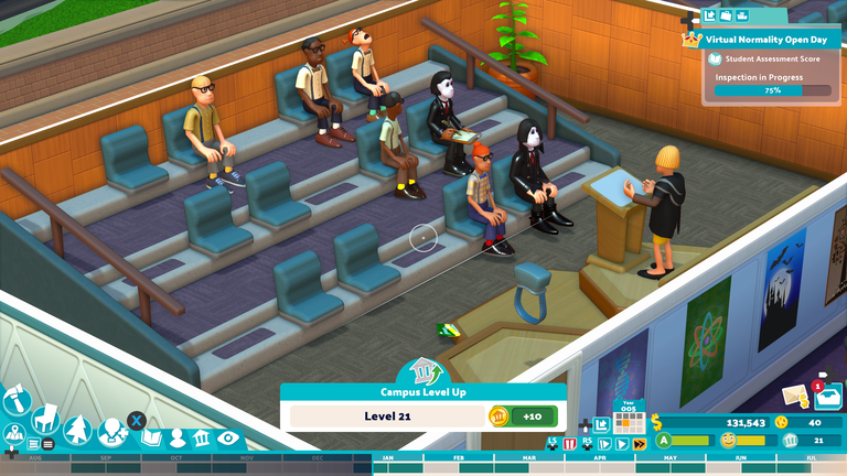 A két egykori Bullfrog-veterán által megálmodott Two Point Campusra is pontosan illik a leírás, hogy egy komoly témát vidáman dolgoz fel: például a felsőoktatáshoz ma már szinte mindenhol kapcsolódó politikai, hát, manőverezésnek nyoma sincs a játékban. Itt mind a nyolc környezetben „egyszerűen” egy újdonsült rektort fogunk alakítani, akinek elsődleges feladata az, hogy a megörökölt, fix épületekbe a rendelkezésére álló szűkös anyagi forrásokat felhasználva a lehető legjobban működő egyetemet húzza fel. Ha ez sikerül, egyre többen iratkoznak be évről évre patinásodó intézményünkbe, ami természetesen egyre több bevételt jelent, és így tovább, amíg csak van kedvünk a sikerspirálban keringeni. Ez persze nem minden próbálkozásra igaz, hiszen túlzott költekezéssel könnyű adósságba verni magunkat, amit ideig-óráig banki kölcsönökkel tudunk ugyan semlegesíteni, de ha még ezek felhasználásával sem sikerül profitábilis rendszert kialakítani, akkor a kamatok és kiadások áradatán csak az állástöltés, esetleg az újrakezdés segíthet.