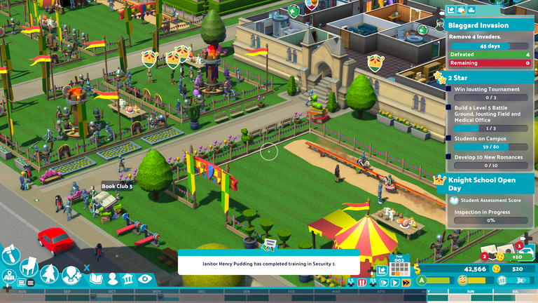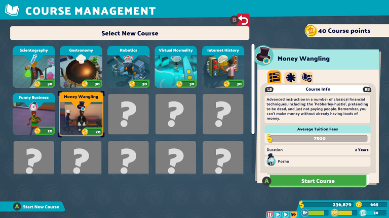 Minden tanév végén a képzésre fordítható pontokat kapunk, amelyekkel vagy új tárgyakat hozhatunk be az iskolába, vagy pedig a már aktív kurzusokat fejleszthetjük. Végső soron mindkét opció további nebulókat csalogat a kampuszra, mechanikailag a különbség mindössze az, hogy a nyári szünetben milyen épületeket kell felhúznunk ehhez. A magam részéről – amikor volt erre hely és büdzsé is – legalább két tantárgyat használtam, már csak azért is, hogy a hovatartozásukat jelmezeikkel is kihangsúlyozó tanoncok ne alkossanak unalmas, „egyenruhás” tömeget. Ez persze csak személyes ízlés kérdése, az is teljesen lehetséges, hogy egyetlen témára specializálódunk rá, igaz, ekkor az azt oktató termekből akár féltucat is dolgozhat már párhuzamosan.