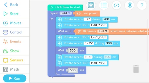 Ez nem hangzik rosszul, de mivel magyar nyelven nem kommunikál a program, azt biztos, hogy a blokkok megértése a magyar gyerekek többségének problémát okozhat. Az itt látható képen egy olyan program látható egyébként, amely elindítja az autót előre, és ha annak infravörös érzékelője akadályt észlel, akkor egy kicsit hátratolat, majd elfordul balra, aztán halad tovább előre. Ha pedig minden irányból falak veszik körbe, akkor értelemszerűen körbe-körbe forgolódik, amíg az akkumulátora le nem merül.