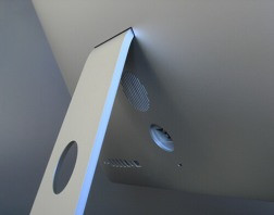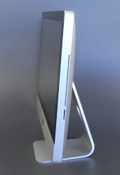 A képernyő, ugyan nem túl tág határok között, de dönthető. Ami igazán meglepett minket, az a szinte tökéletes kiegyensúlyozás volt. A zsanéron akár egy ujjal, nagyon kis erő kifejtésével lehetett előre-hátra dönteni a monitort, ami természetesen fixen a beállított pozícióban maradt. Az iMac jobb oldalára került a slot-in 8x-os DVD-író és az SD memóriakártya-olvasó.