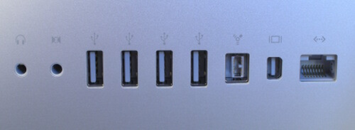 Ugyancsak a gép hátulján, alul gyülekeznek katonás sorban a különféle aljzatok. Találunk itt hang ki- és bemenetet, négy darab 2.0-s USB-t, FireWire 800 aljzatot, továbbá mini DisplayPort és Gigabit Ethernet csatlakozót. A mini DisplayPortra ráköthető az Apple LED Cinema Display is másodlagos megjelenítőként például, de MacBook és MacBook Pro is csatlakoztatható rá.