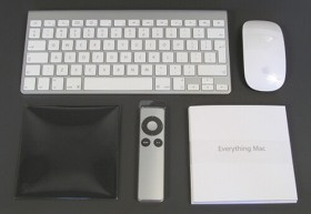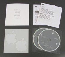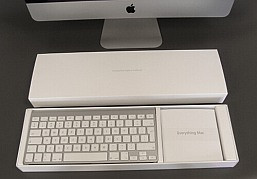 Az Apple gép mellé tehát kaptunk billentyűzetet, egeret és távirányítót, továbbá egy puha kendőt a képernyő tisztán tartásához. A másik csomagban használati utasítások, dokumentációk voltak, két Apple matrica, egy telepítő és egy rendszer-visszaállító DVD. Tehát elég bőséges a felhozatal.
