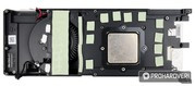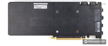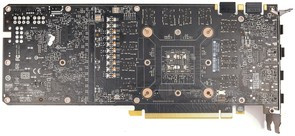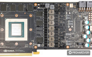 Alaposan beburkolták a kártyát, mind alul, mind pedig felül. A hátoldali csatlakozók között három darab DisplayPort 1.4 és egy HDMI 2.0b-t találunk, a DVI előbb említett hiányát pedig átalakítóval enyhíthetjük, ha mégis szükség lenne rá. A hűtés nem tartogat különösebb meglepetéseket: a GPU közvetlen érintkezik a bordával, a többi komponens, mint a VRM, a memóriák és 1-2 chip pedig hővezető padokon keresztül juttatják át a hőt. A hátoldal nem vesz részt komolyabban a hőleadásban, bár jól láthatóan van némi szerepe, hiszen a hátoldalon is van chip, ami hővezető padot kapott.
