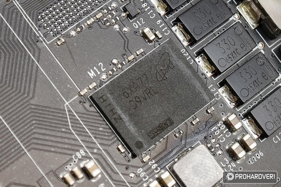 A Microntól származó, FBGA tokozású, 6XA77 D9VRL kódjelű, GDDR5X típusú VRAM-modulok a katalógus szerint az MT58K256M321JA-110 chipeknek felelnek meg. Ennek darabja 1 GB kapacitású, üzemi feszültsége 1,35 volt, effektív órajele 11 GHz. Ebből értelemszerűen 11 darabot találunk a NYÁK-on.