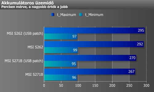 A két MSI noteszgép akkumulátoros eredményei meggyőzőnek mondhatóak, különösen az AMD-s rendszer fejlődött sokat az egymagos Turionnal ellátott elődhöz képest. Az S271B itt nagyon szépen feljött az S262 nyakára, sőt, a teljes terheléssel végzett mérésnél gyakorlatilag be is érte az inteles gépet a kétmagos Turion 64 X2-vel szerelt notesz. Az AMD processzorával felvértezett notebook az olvasgatós tesztben sem szedett össze komoly hátrányt, mindemellett még az S262 tulajdonosa sem örvendhet ötórás akkumulátoros üzemidőnek (igaz csak öt perc választja el ettől az inteles gépet).