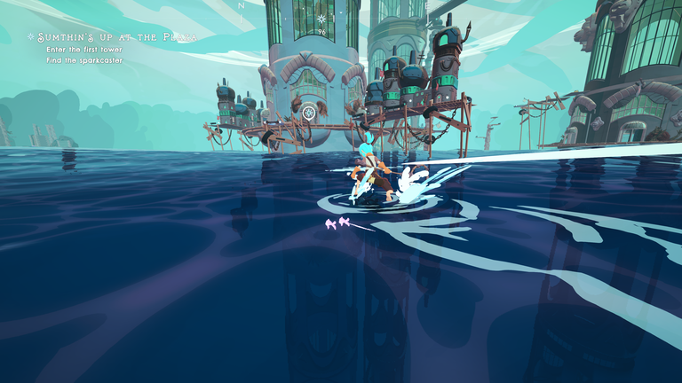 Természetesen első feladatunk a fehér puffancsok formáját felöltő energialények befogása lesz a legközelebbi szigetecskéken – emitt egy még a régi, gondtalan világot idéző óriáskerék, amott egy magasba nyúló daru lóg ki a hullámok közül. Normál esetben a közlekedés kizárólag hajóval lehetséges, hiszen a víz mélyén halálos bestiák lesnek áldozatra, de Sigrid, nyilván, kivételt jelent. A kékhajú lányt a játék indulásakor egy szökőár ragadja el, a pusztító csapás azonban nem végez vele – sőt, az égig érő vízfal mélyén megpillantott ismeretlen lény még a segítségét is felajánlja neki. Innentől kezdve hősünk képes lesz a vízen járásra, a hullámokon siklásra, a delfinezésre – vagyis megnyílik előtte a teljes világ, vagy legalábbis azon része, ahová az utat nem zárja el a fekete köd.