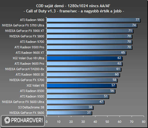 Első körben az OpenGL API-ra épülő Quake3-motoros játékokat teszteltük le. A Volari Duo Q3 alatt a leggyorsabb FX-ekkel versenyez, viszont Wolf és COD alatt csak a középkategóriás FX 5600 Ultra és Radeon 9600 Pro szintjét üti meg. A Volari V8 eredményei ehhez képest igencsak gyengék, Q3 alatt a Duo teljesítményének a felére, Wolf alatt annál valamivel többre, míg COD alatt csak nagyon picivel kevesebbre képes. A gyengébbik Volari inkább alsó, mint középkategóriás kártyaként viselkedik.