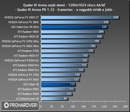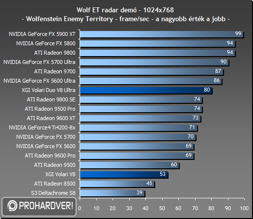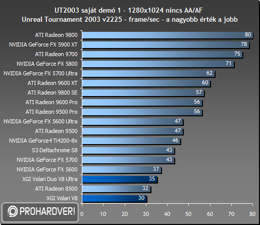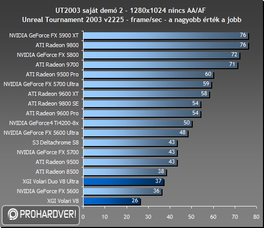 Első D3D-s játékunkban, az UT2003-ban mindkét Volari nagyon leszerepel, az erősebbik Volari is csak a Radeon 8500 szintjén képes teljesíteni.